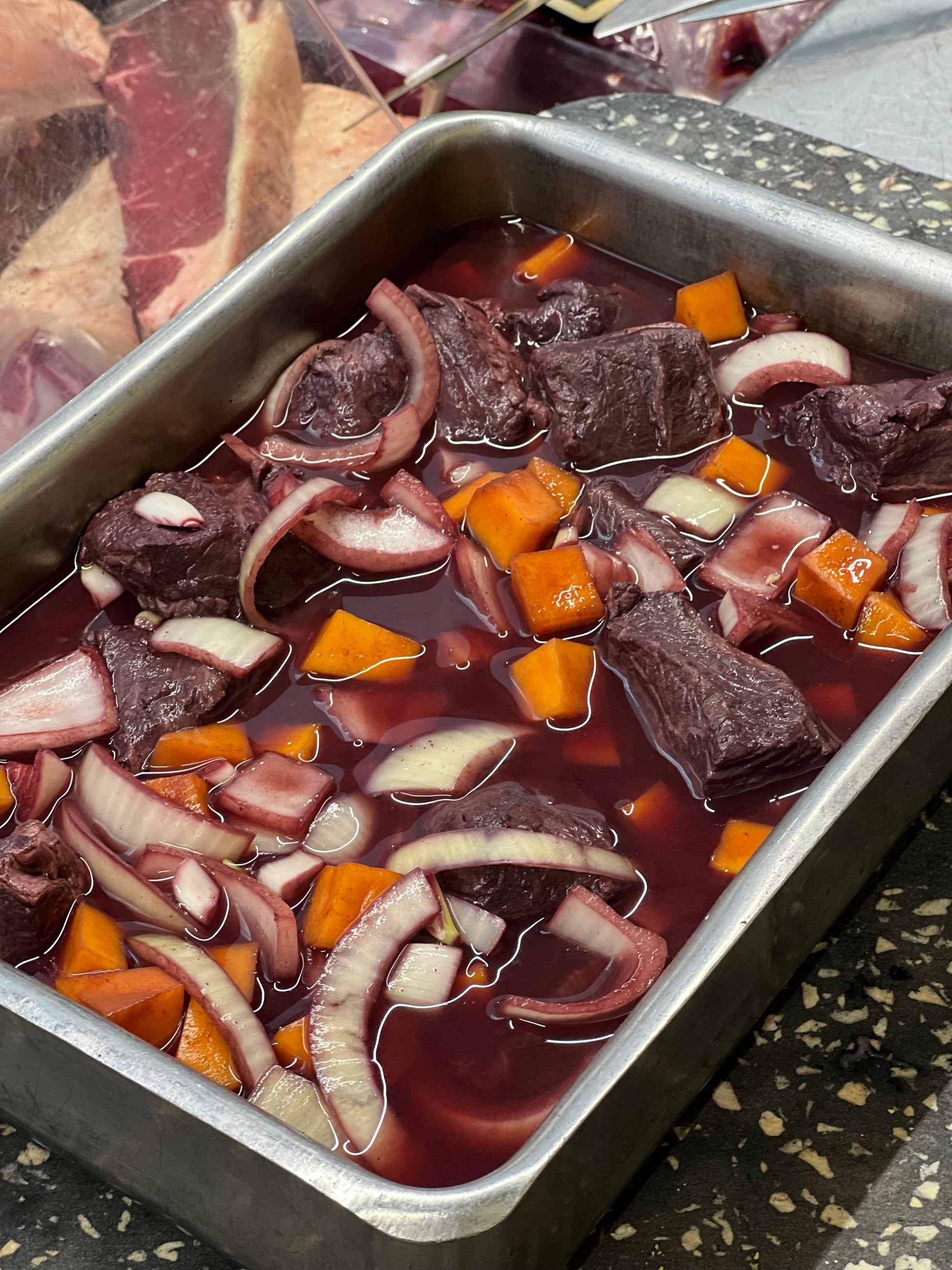Un plat à mijoté comme on les aime : paleron de bœuf fondant, cubes de butternut rôtis, oignons et vin rouge, relevés par un doux mélange d’épices d’automne (cannelle, muscade, laurier).